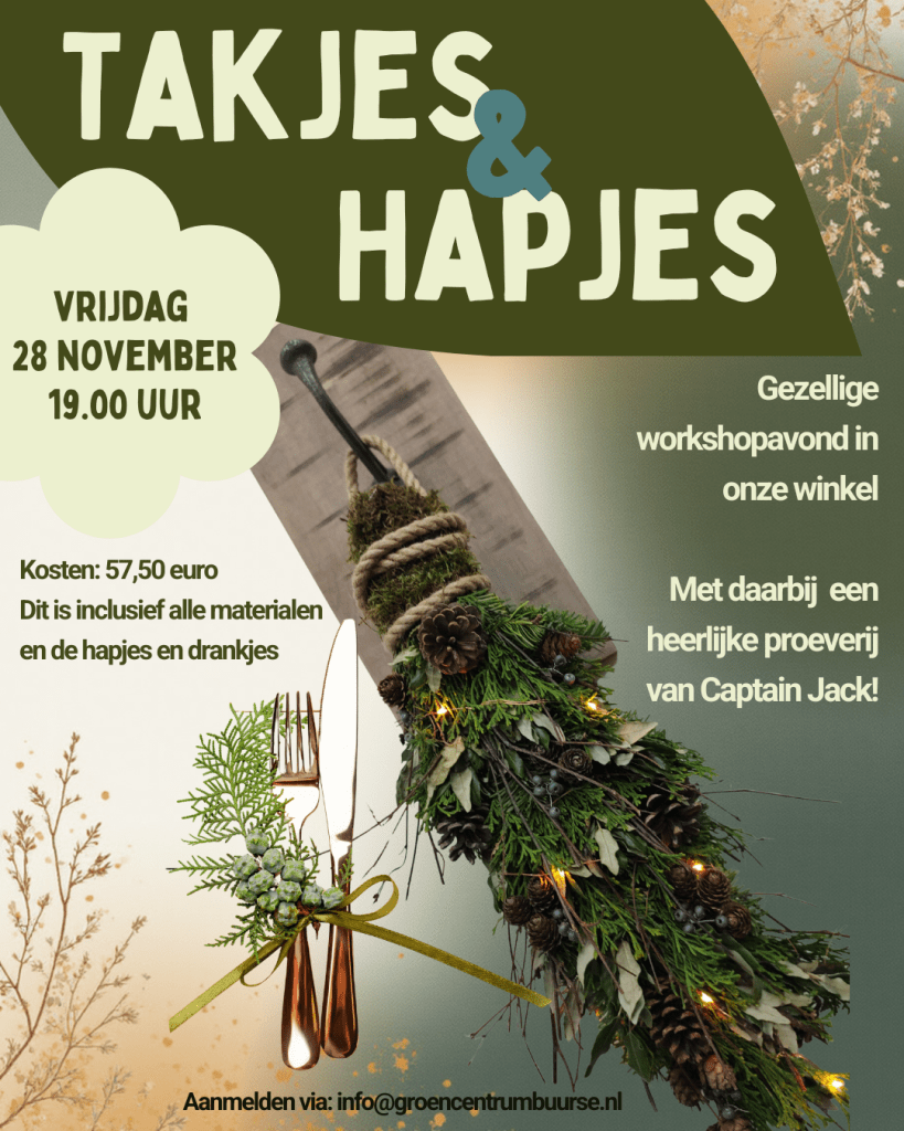 We gaan een winterse festoen maken, deze komt te hangen aan een landelijke kapstok. Daarbij serveren we een lekkere proeverij met hapjes van restaurant Captain Jack uit Buurse.